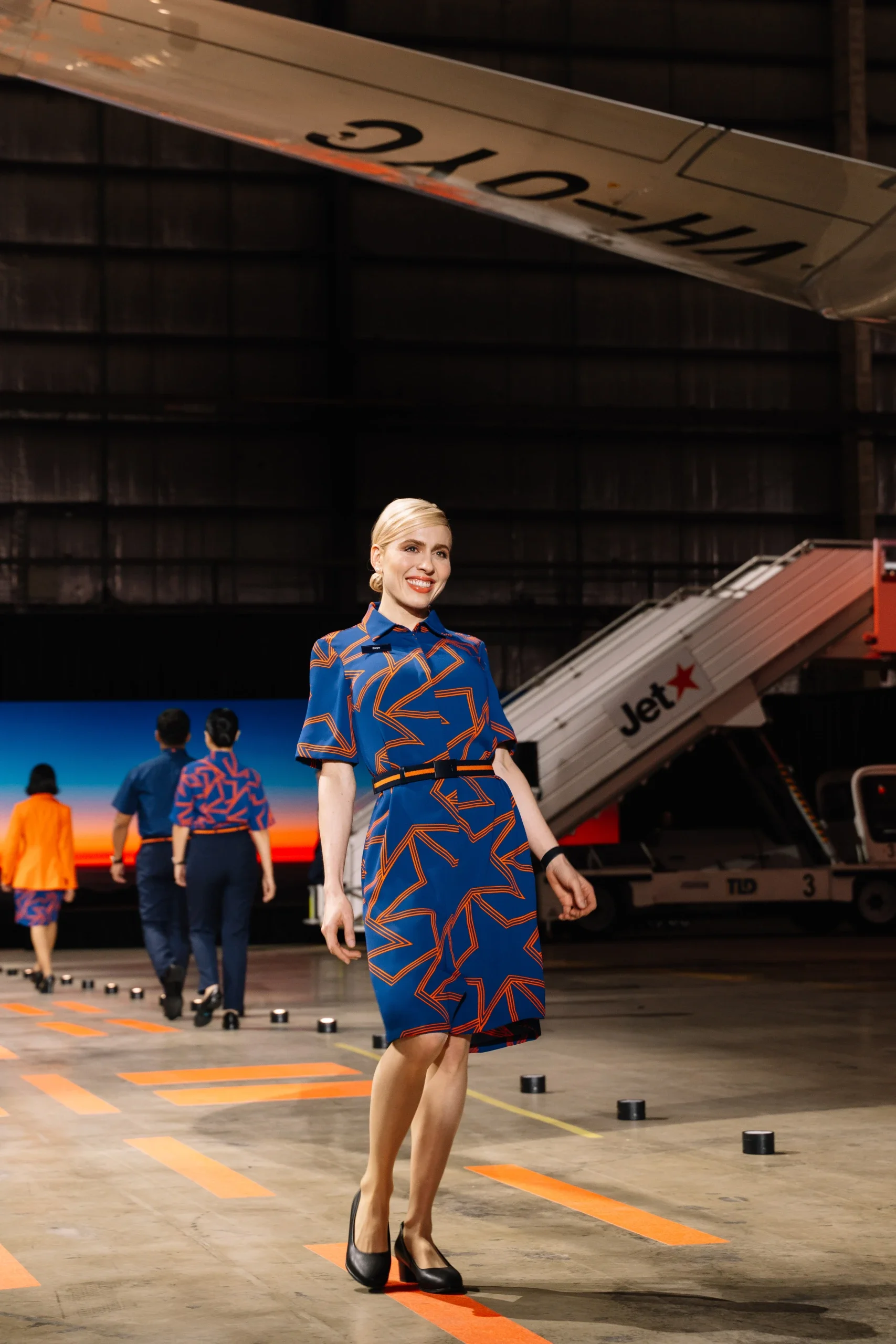 Genevieve authored the creative direction and design of the Jetstar uniform collection, capturing the essence of the democracy of travel and signalling a new era for the airline. Drawing inspiration from the glow of a sunset seen through an aircraft window and the anticipation of a journey, the collection was developed through close engagement with pilots, cabin crew and airport teams. A luminous palette of orange and blue, anchored by a signature star print, is paired with versatile silhouettes that balance clarity, professionalism and ease. Now worn by more than 5,000 frontline team members across Australia, New Zealand, Japan and Singapore, Genevieve’s custom print and colour palette have since extended across the broader Jetstar brand.